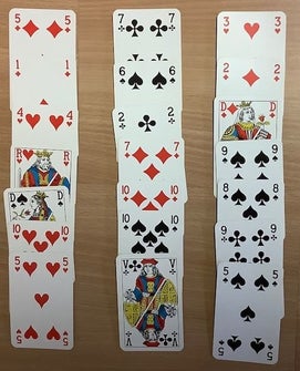 Verzamel telkens de kaarten in 3 stapeltjes,